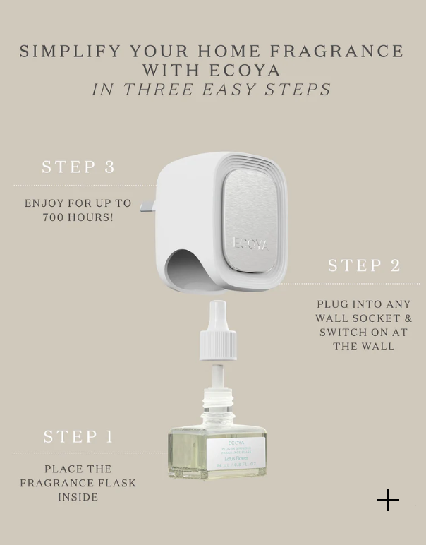 Instructions for use: Ensure you have purchased an ECOYA Fragrance Flask. Remove lid from the Fragrance Flask and insert into the base of the Plug-In Diffuser. Plug into an upright wall socket and switch on power. Ensure the fragrance flask is kept vertical at all times. In case of spillage, wipe surface immediately with damp soft cloth.
